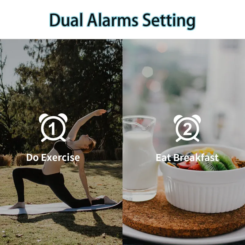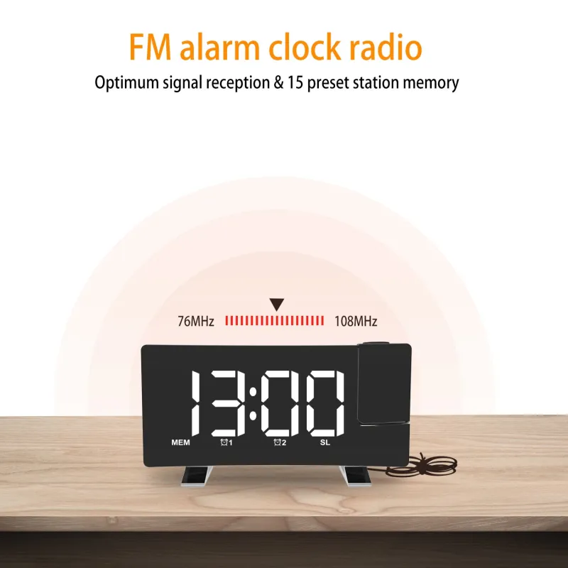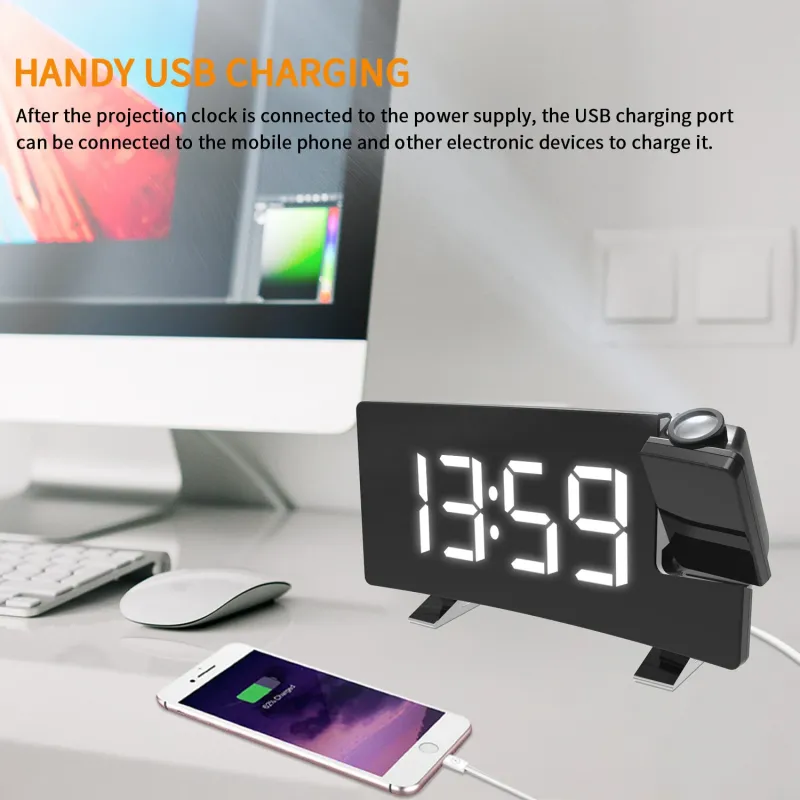 AGSIVO 8 Inch Projection Alarm Clock with 180 Rotatable Projector / FM Radio / Snooze / 3-Level Brightness Dimmer / Curved Clear LED Display / USB Charger For Bedroom Living Room