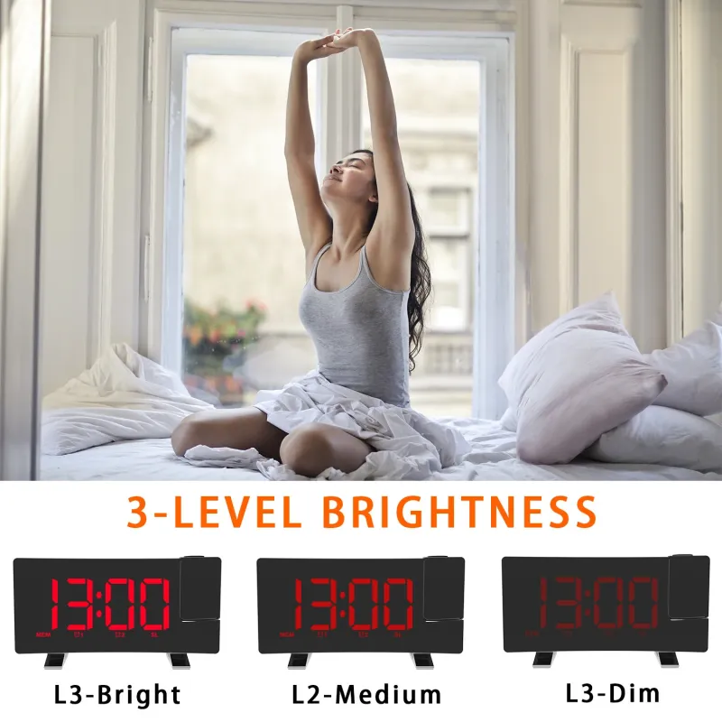 AGSIVO 8 Inch Projection Alarm Clock with 180 Rotatable Projector / FM Radio / Snooze / 3-Level Brightness Dimmer / Curved Clear LED Display / USB Charger For Bedroom Living Room