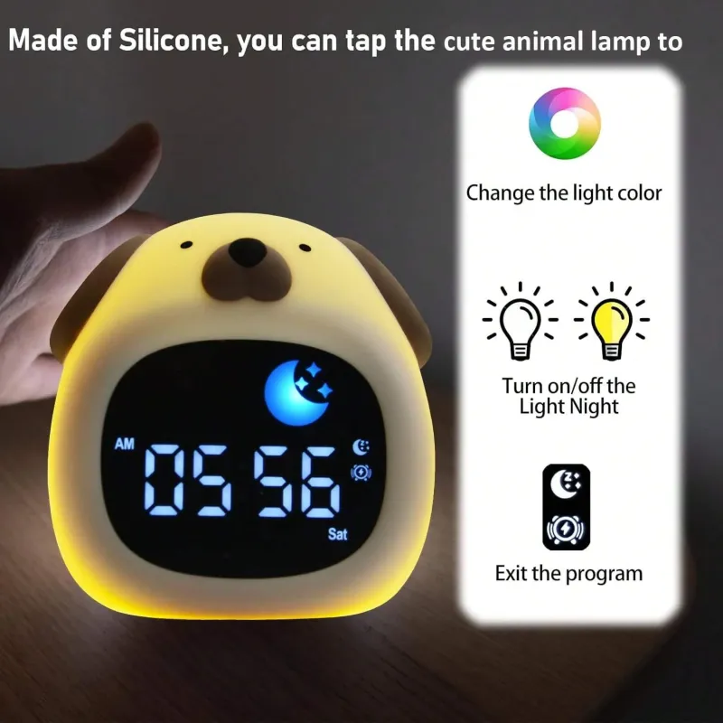 Kids Alarm Clock Sleep Trainer Clock Kids Room Cute Toddler Puppy Shape Night Light Clock Touch Night Light with 6 Types of White Noise 8 Color Night Light