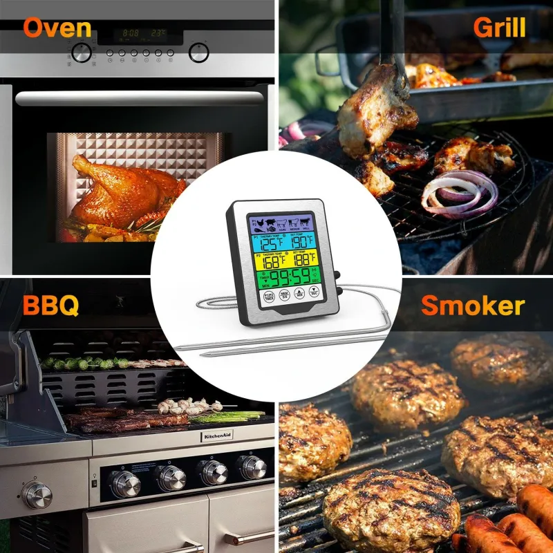 Dual Probe Large Colorful Touchscreen Food Meat Thermometer Kitchen Cooking BBQ Thermometer High Temperature Alarm Fahrenheit or Celsius Preset Temperature With Stand