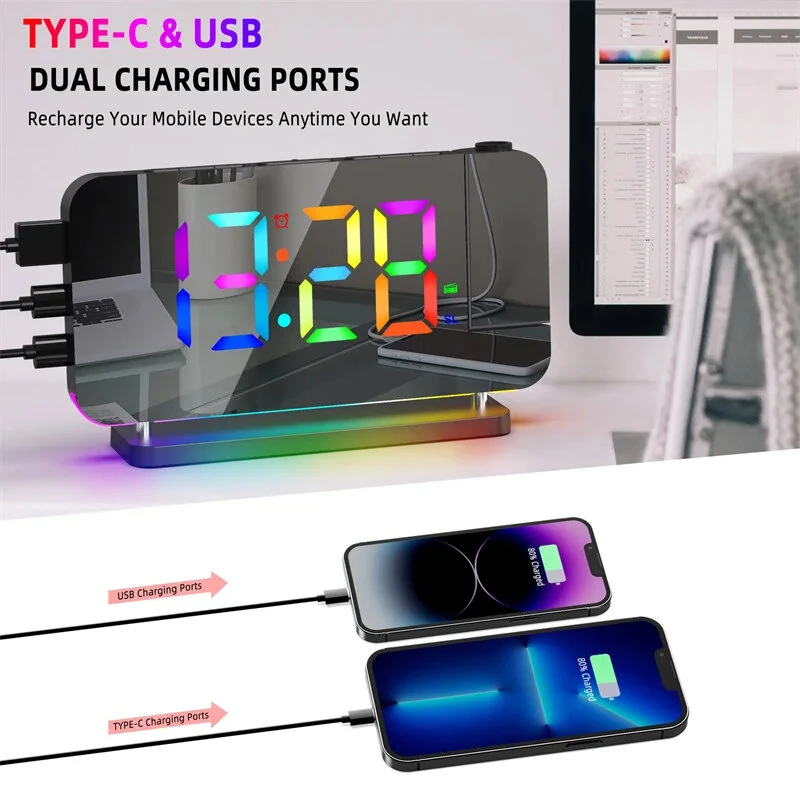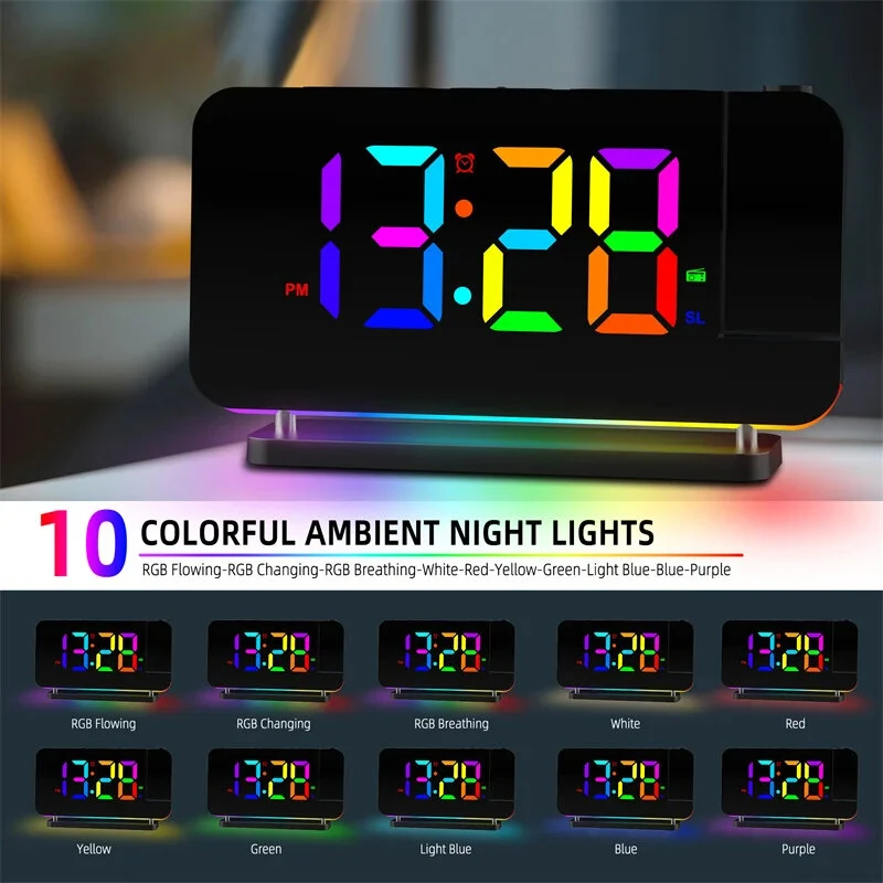 180 Rotation RGB Colorful Night Light Radio Projection Clock Projection Digital Alarm Clock With Night Light 2 USB Output Port 12H/24H FM Radio Time Projector LED Clock