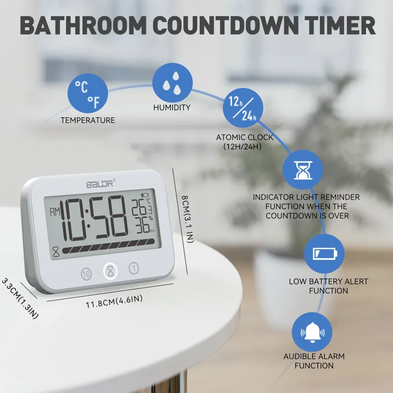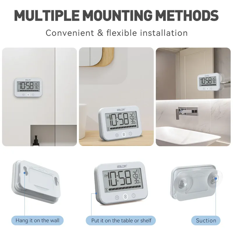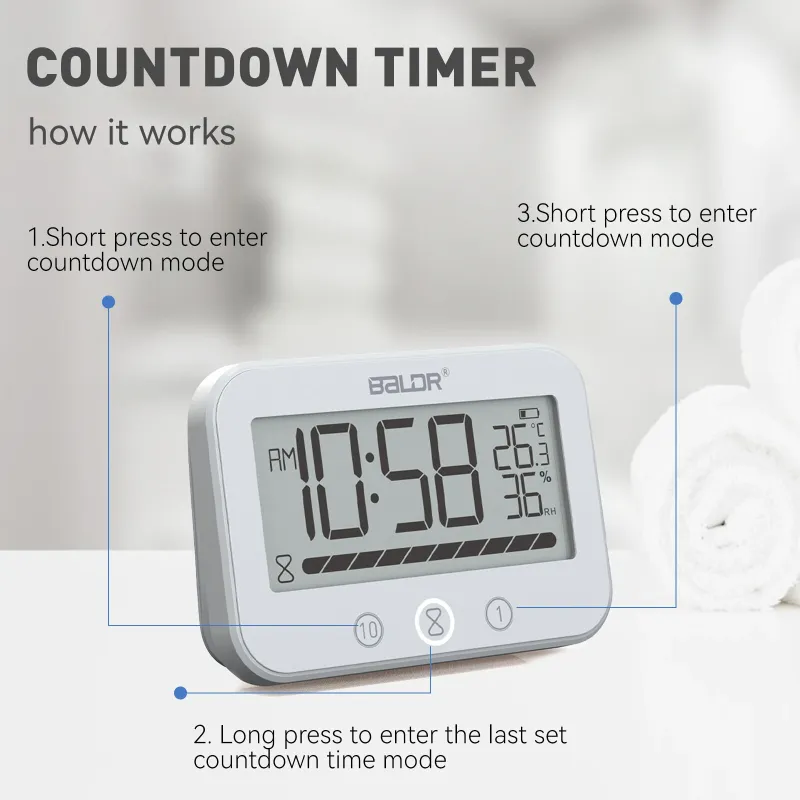 BALDR Waterproof Countdown Thermometer Hygrometer Multifunctional Electronic Thermometer And Hygrometer With Countdown Function Bathroom Clock Thermometer Hygrometer Alarm Reminder