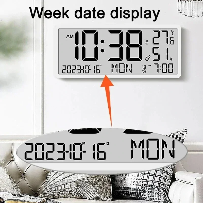 Large LCD Digital Wall Clock Temperature Humidity Display Alarm Clock Hanging/Desktop Digital Clock Plugged in Electronic Desktop Clock for Home and Offices