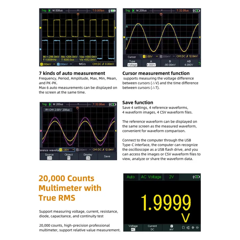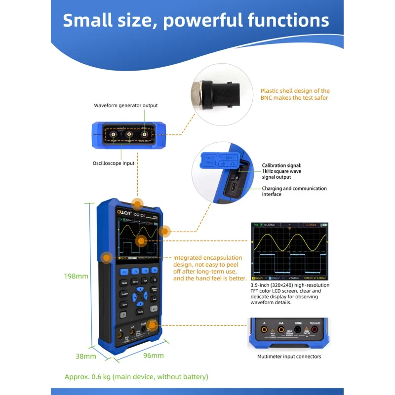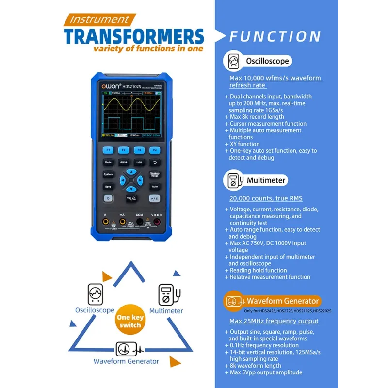 OWON HDS2202/HDS2202S 2CH Handheld Oscilloscope 200MHz Bandwidth 20000 Counts Multimeter OSC + DMM + Waveform Generator 3 in 1 Suitable for Automobile Maintenance and Power Test HDS2202 HDS2202S
