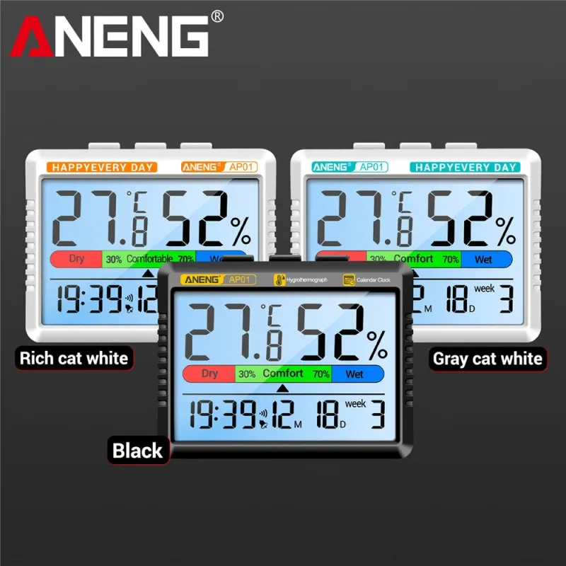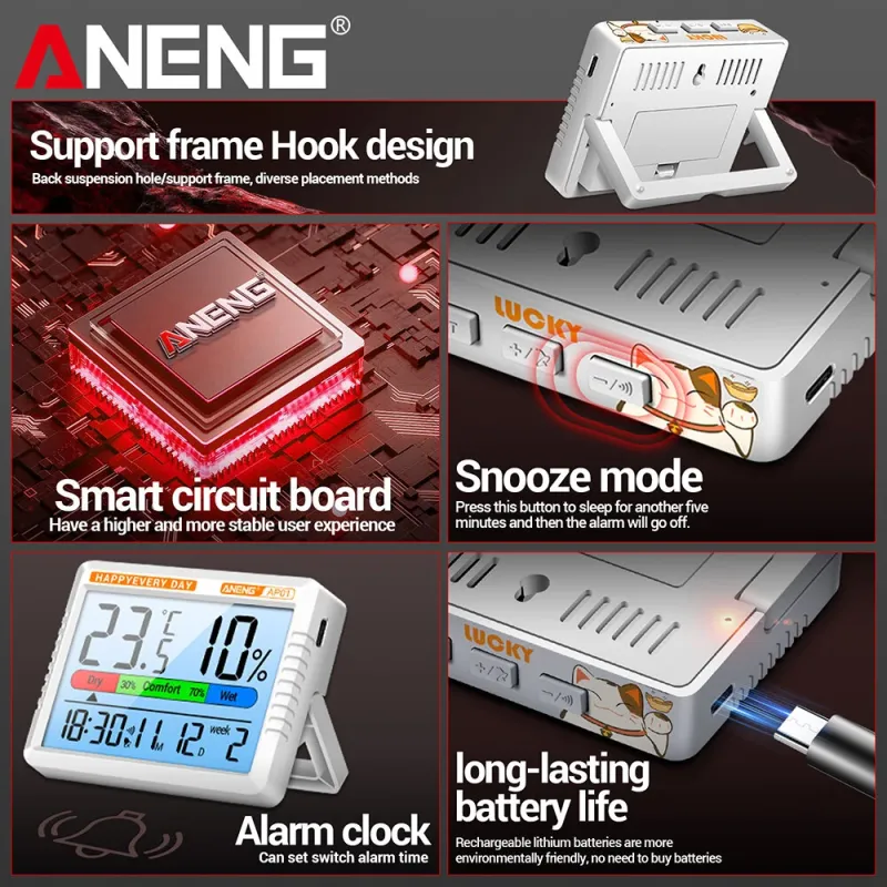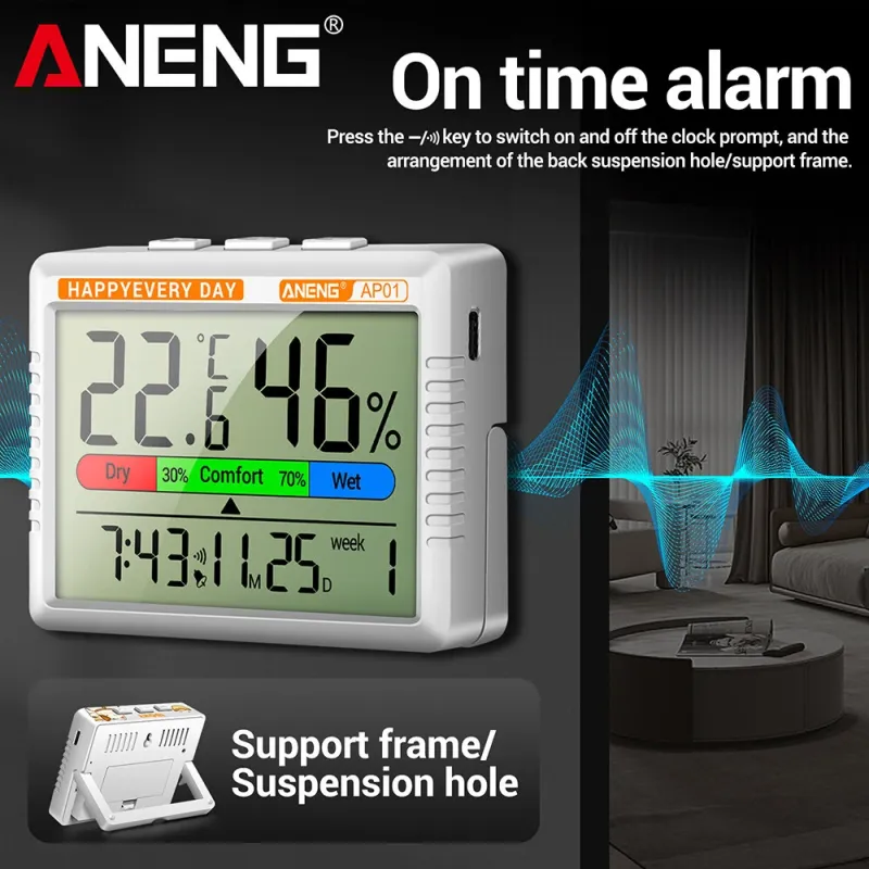 ANENG AP01 Thermohygrometer Clock with Backlit LCD Display Real-Time Temperature and Humidity Monitor Built-in Alarm and Calendar Type-C Charging