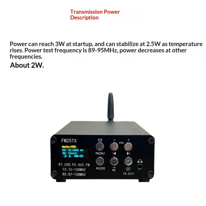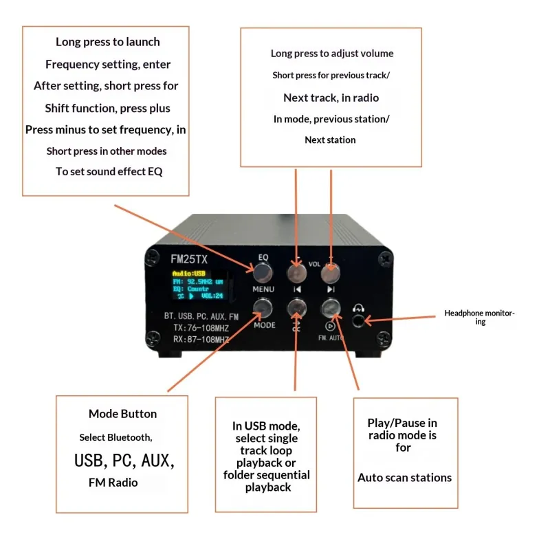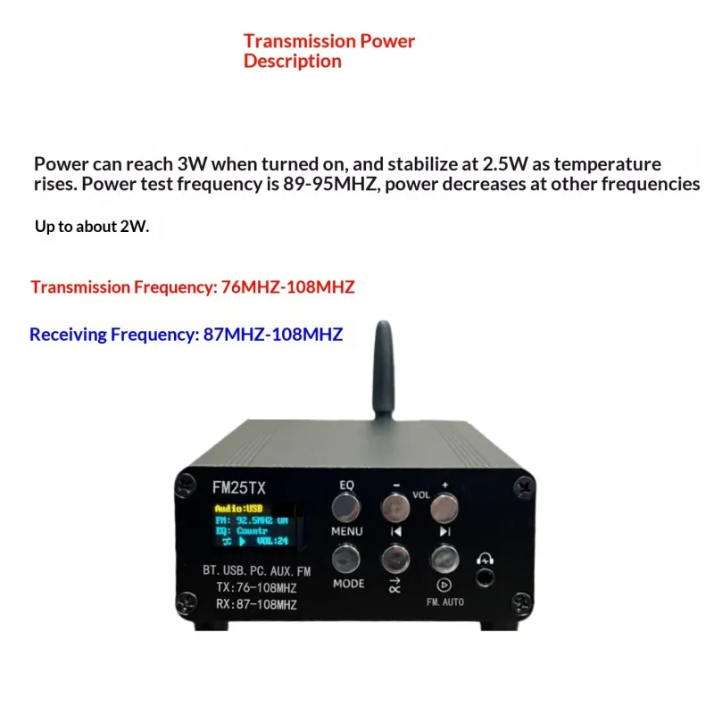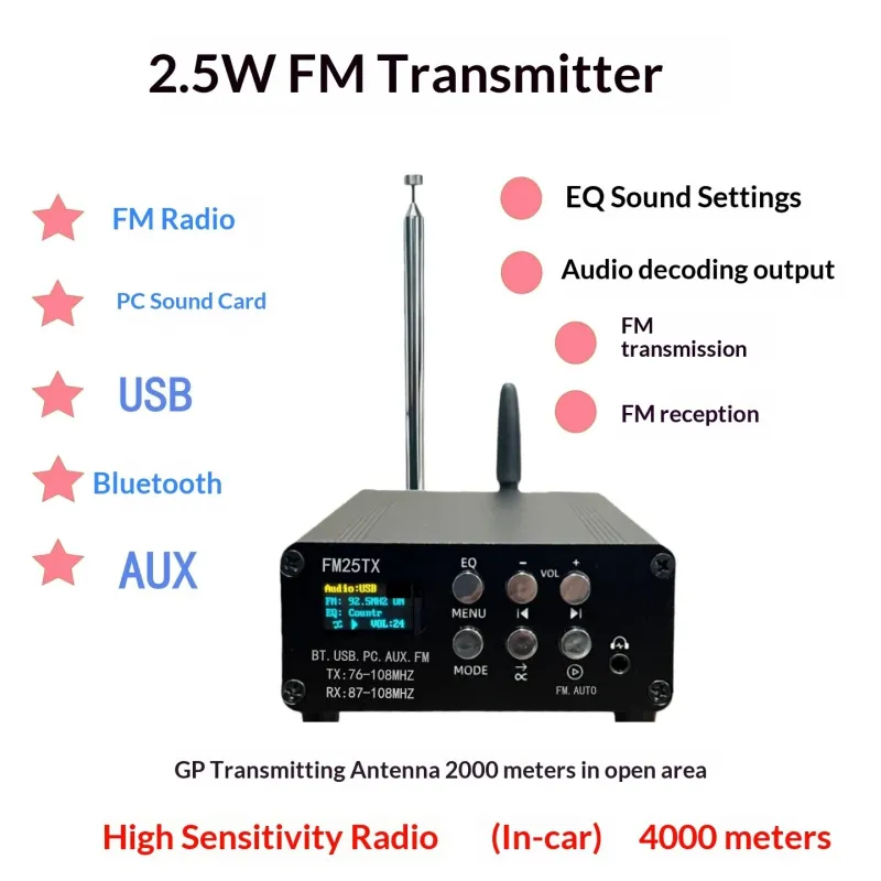 FM25TX FM Transmitter 2.5W Long Range Wireless Audio Player Bluetooth 5.3 USB Sound Card AUX Input EQ Modes MP3 WAV FLAC Support