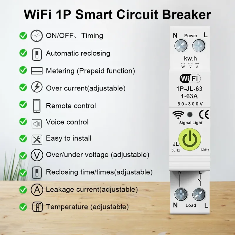 Tuya WiFi Intelligent Circuit Breaker ON OFF Timing Energy Meter Automatic Reclosing Protector with Metering and Prepaid Function Compatible with Alexa and Google Assistant for Voice Control