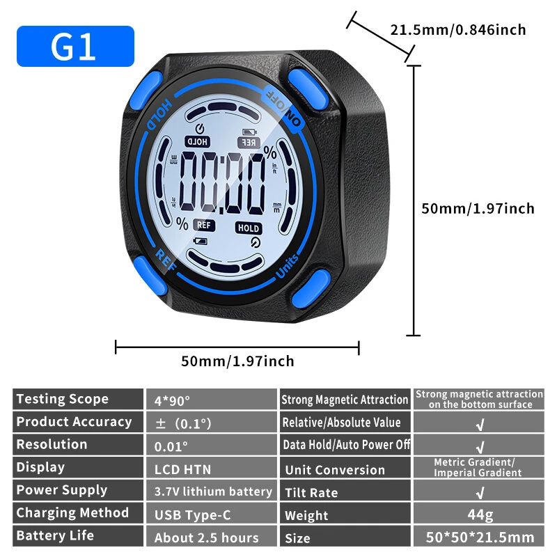 SNAKOL G1 Digital Inclinometer High Precision 0.1 Resolution 0.01 Magnetic Base Lightweight USB Type-C Rechargeable Angle Measurement Tool