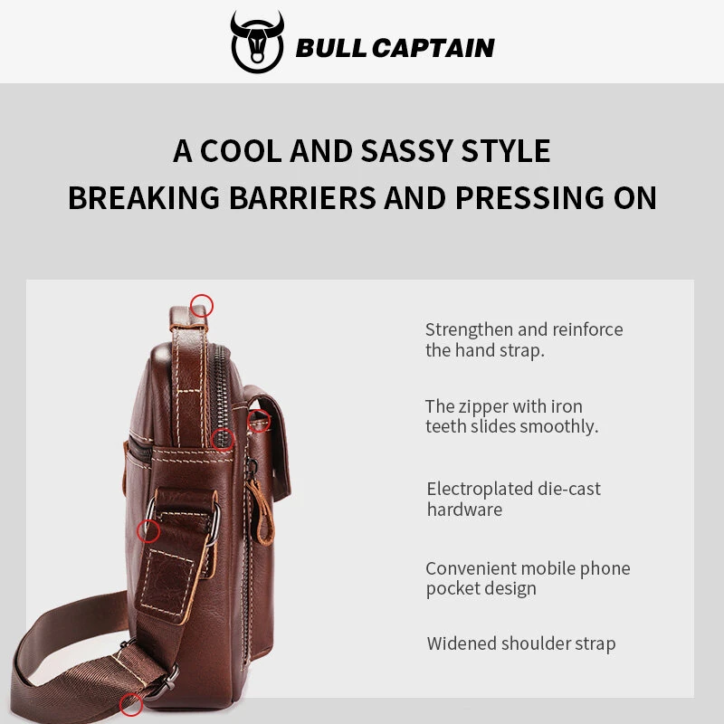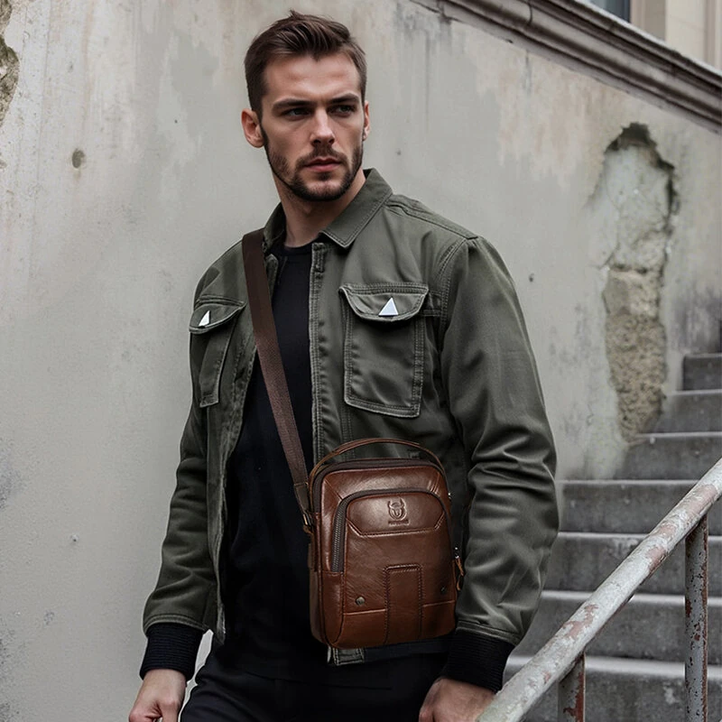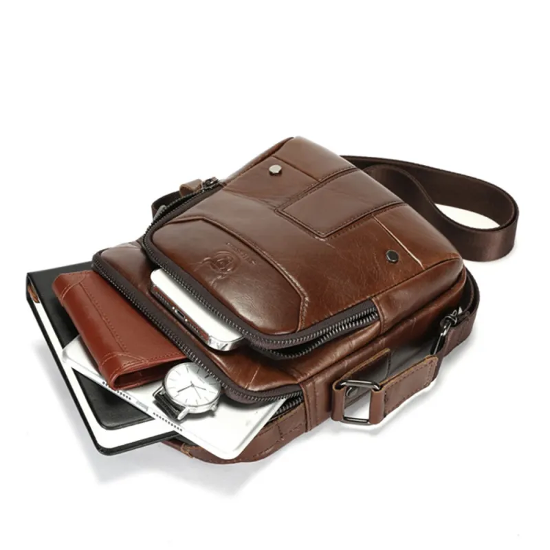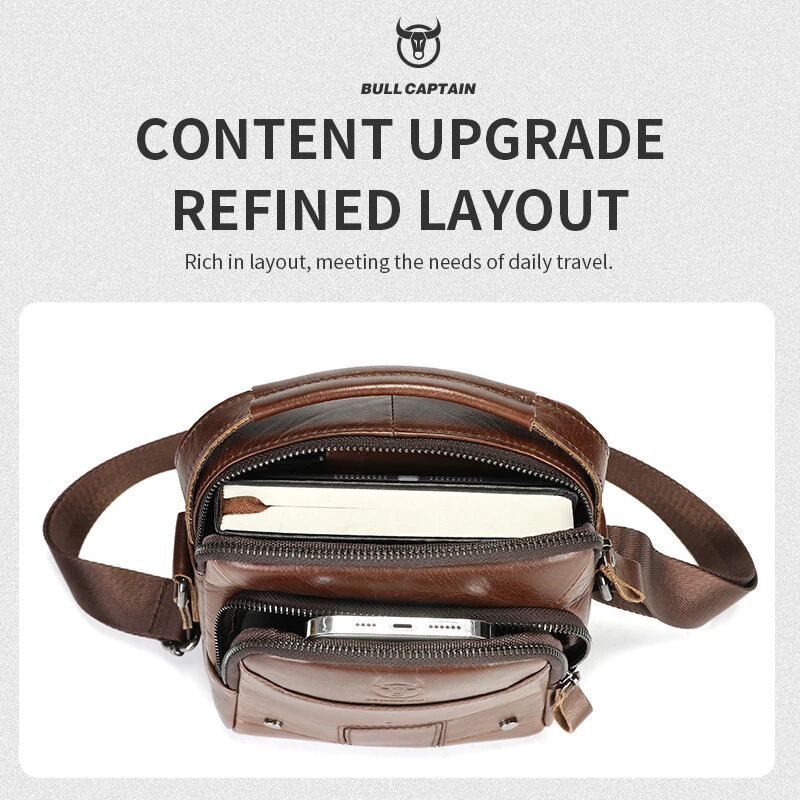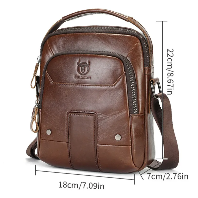BULLCAPTIAN Men's Soft Genuine Leather Messenger Bag Business Casual Multi-functional Zipper Handheld Crossbody Bag