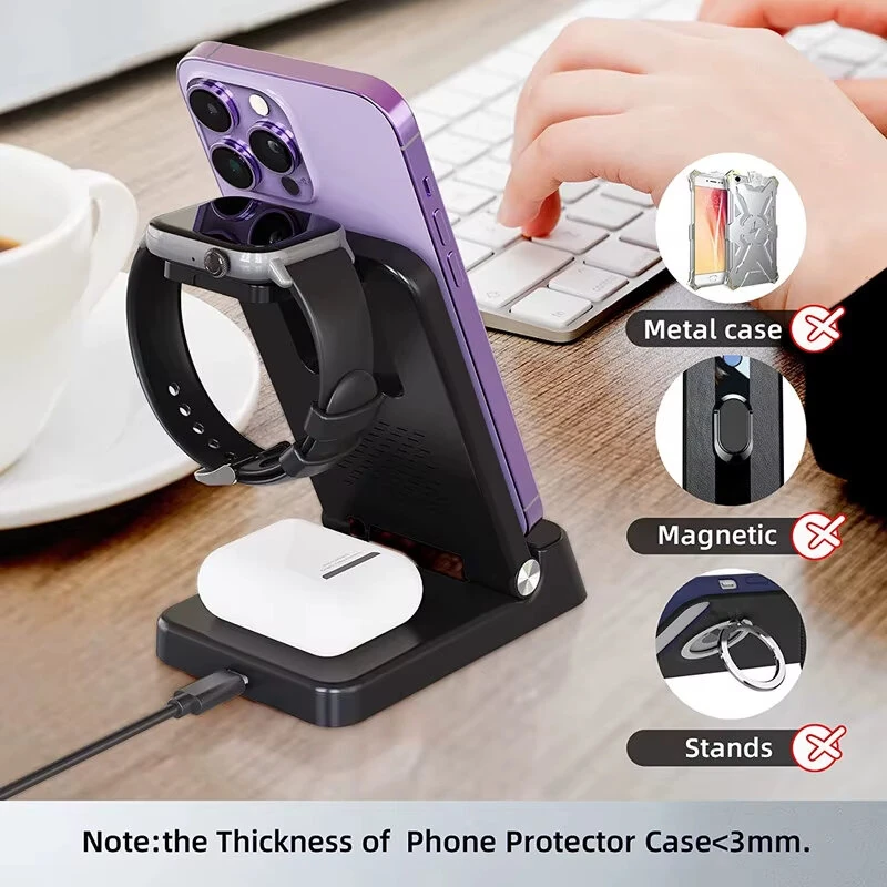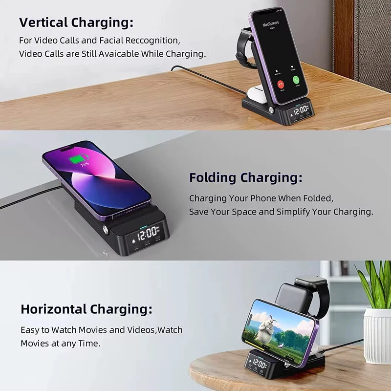 4-in-1 Foldable Alarm Clock 15W Wireless Charger Phone Bracket Fast Wireless Charging Stand for iPhone 17 17 Pro 16 Pro Max 15 14 13 for Huawei Mate XTs for Xiaomi 17pro for Samsung Galaxy S25 Ultra Apple Watch for Airpods