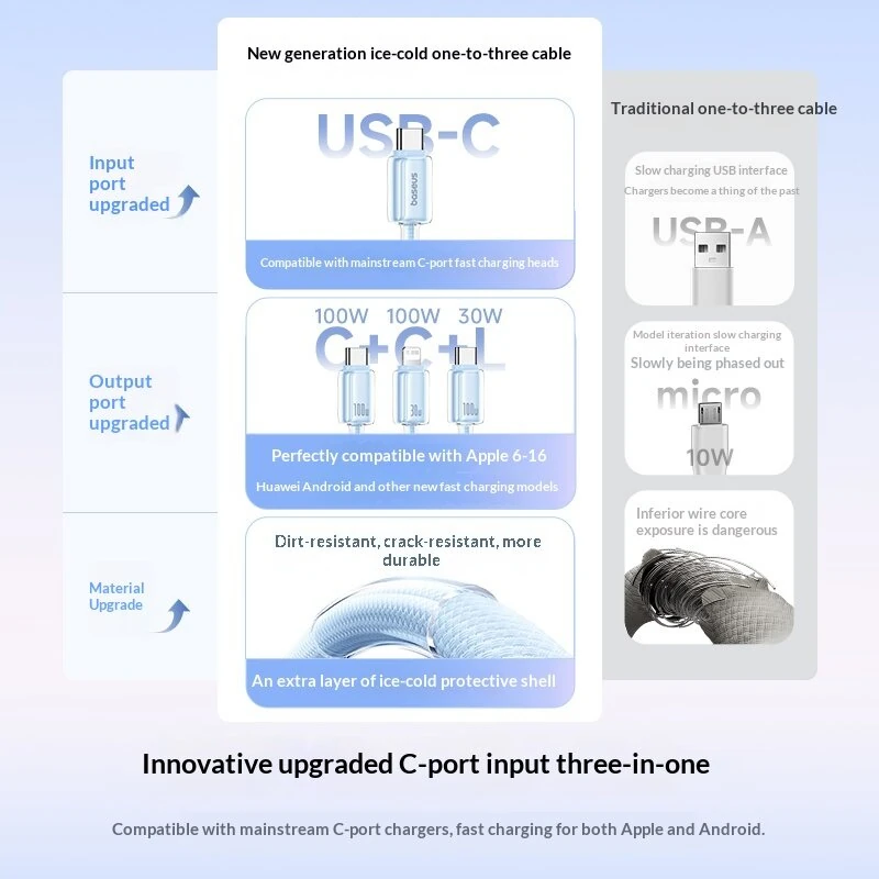 Baseus ICY Series 100W Type-C to Type-C+Type-C+iP Cable Fast Charging Data Transmission Copper Core Line 1.5M Long for iPhone 17 17Pro 16 Pro Max 15 14 13 for Huawei Mate XTs for Samsung Galaxy S25 Ultra for iPad Pro for OPPO for VIVO