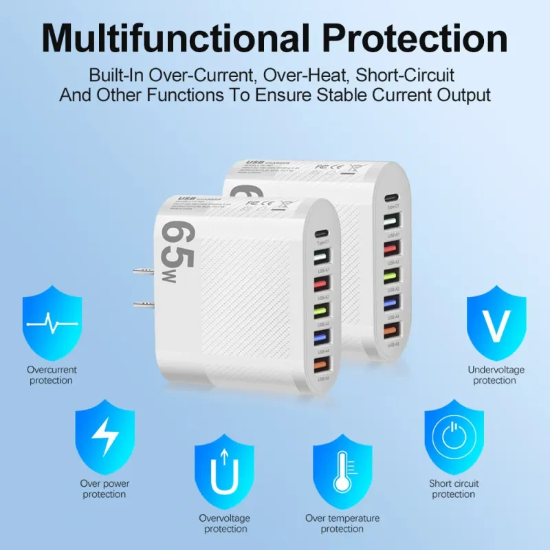 LYK-881 65W 6-Port USB Charger 5USB-A+Type-C ast Charging Wall Charger Adapter EU Plug US Plug for iPhone 12 13 14 14 Pro for Samsung Galaxy S23 for Xiaomi13pro for Oppo Reno9