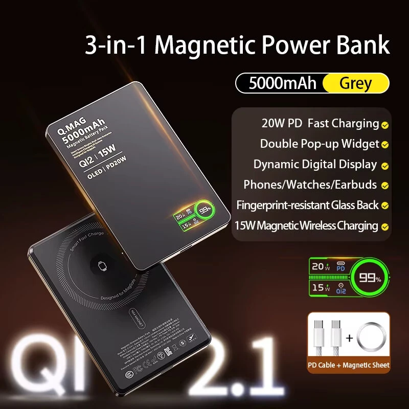 E16A3 20W 19.25Wh 5000mAh 3-in-1 Wireless Magnetic Power Bank with Smart LCD Display External Battery Power Supply with 1 Input & 2 Outputs Support PD Fast Charging for iPhone 17 17 Pro 16 Pro Max 15 14 for Xiaomi 17pro for Samsung Galaxy S25 Ultra
