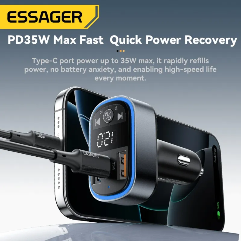 ESSAGER F748 bluetooth 5.3 FM Transmitter 2USB-A+USB-C PD3.0 QC3.0 FCP AFC iP2.4 USB Car Charger LED Digital Display Support TF Card/U Disk Wireless Radio Adapter HiFi Music Play Car Kit With Mic Hands Free Calls