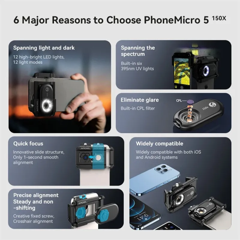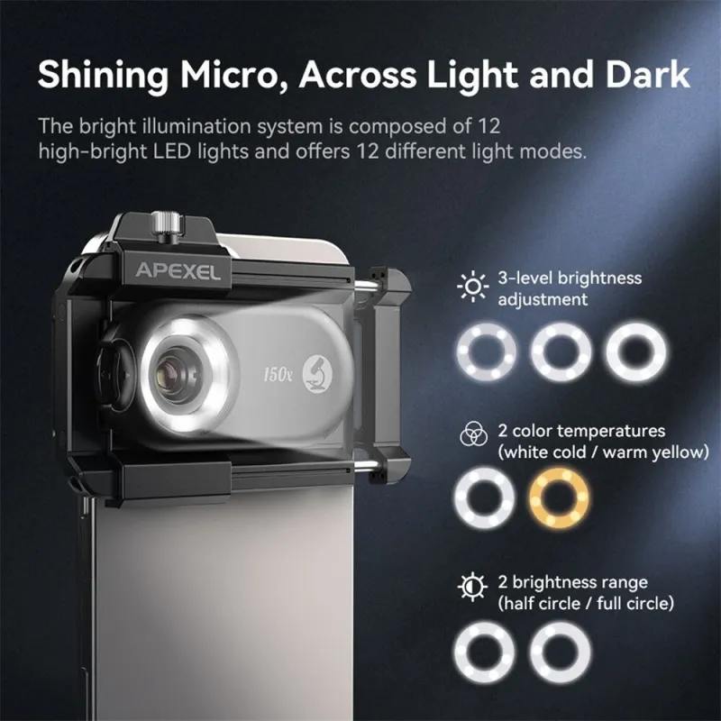 APEXEL 3in1 100X/150X/200X Mobile Phone Microscope Lens Macro Magnifier Kits High Magnification CPL Polarized Lenses 12 LED Adjustable Modes 6 Ultraviolet Lights