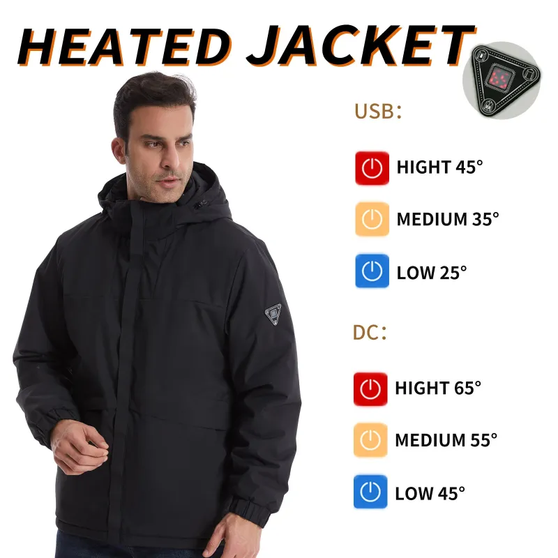 TENGOO HJ-04B 4 Zones Heated Jacket -3-Gear Thermal, with Digital Display, Windproof & High Neck Hooded, Unisex Comfort Coat for Winter Hiking Outdoor Sport