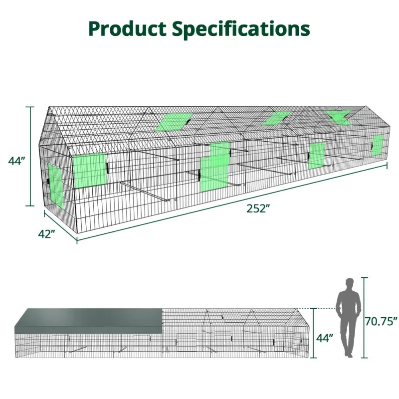 Metal Chicken Coop, 21ft x 3.5ft Chicken Run Pen for Yard with Cover Outdoor Metal Portable Chicken Tractor Cage Enclosure Crate Outside for Small Animals Duck Rabbit Hen
