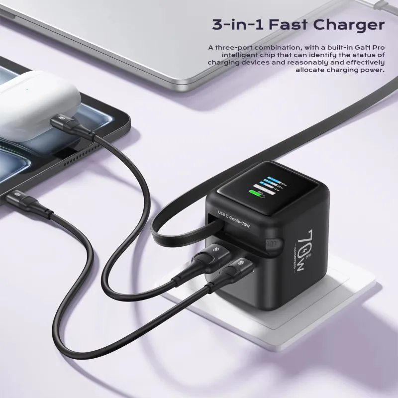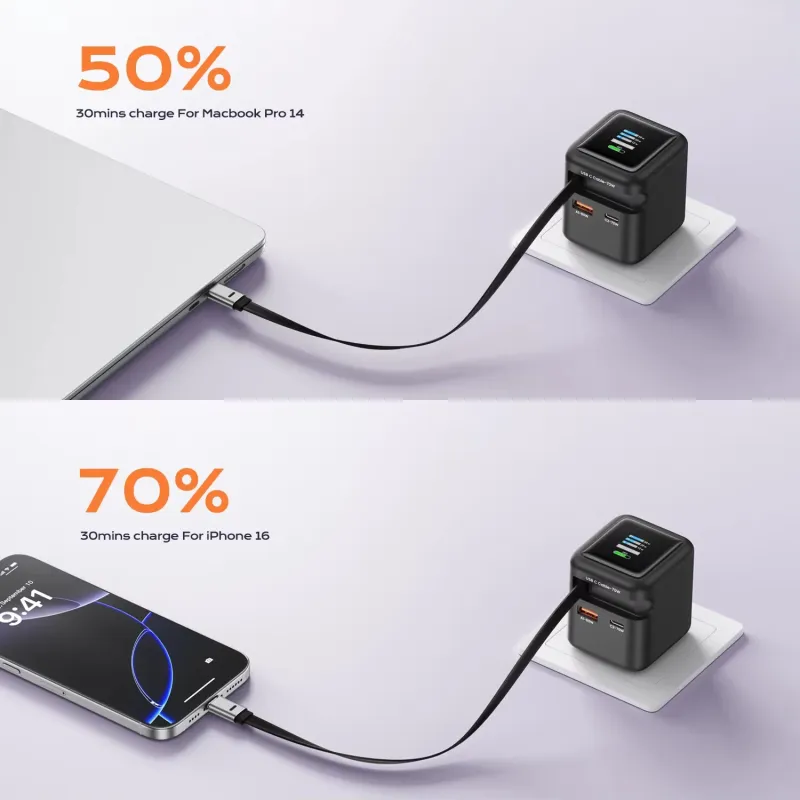 [GaN Tech] ASOMETECH CH055-PQ PD70W 2-Port USB PD TFT Display Charger Come with Type-C Retractable Cable+USB-A+USB-C PD3.0 QC4.0 AFC FCP SCP PPS Fast Charging Wall Charger EU Plug for iPhone 17 17Pro 16 15 14 Pro Max for Xiaomi 17pro for Oppo Find X9