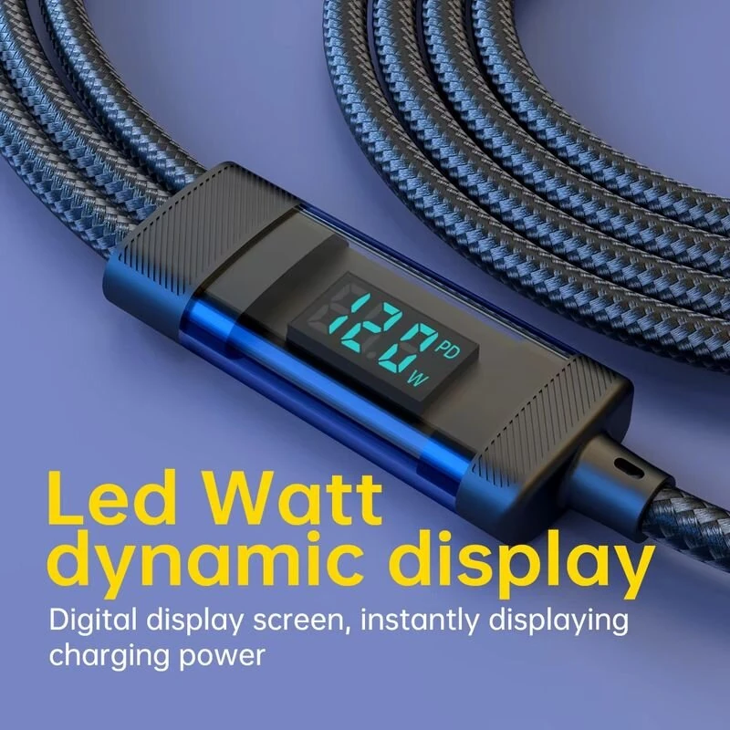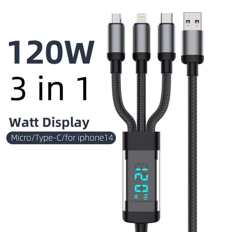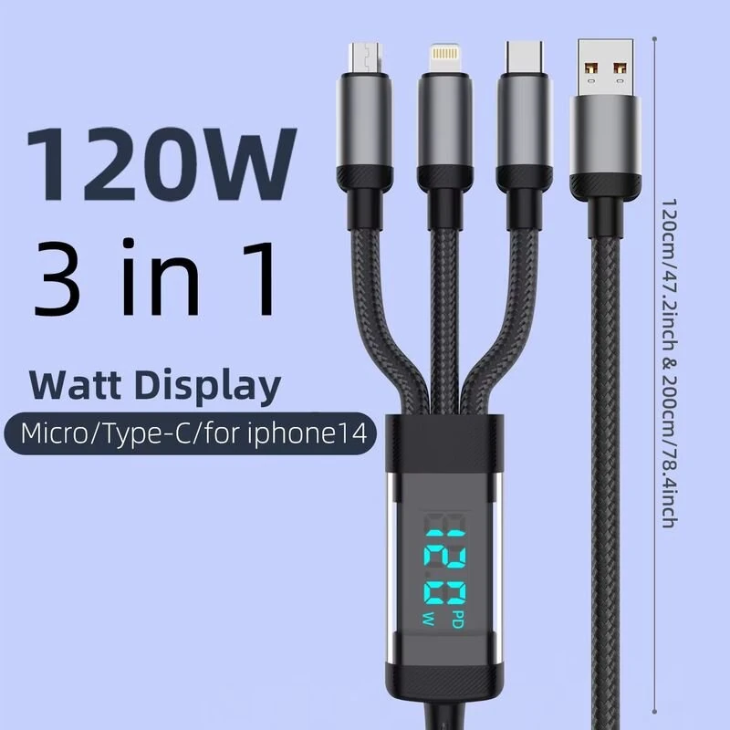 120W USB-A to iP/Type-C/Micro USB Digital Display Cable PD Fast Charging Data Transmission Tinned Copper Core Line 1.2M/2M Long for iPhone 16 15 Pro 14 13 Pro Max for Huawei Pura 80 Ultra for Xiaomi MIX Flip 2