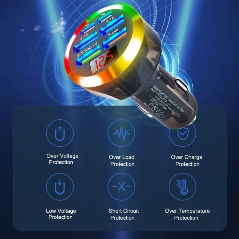 200W 6-Port USB PD Car Charger Adapter 4USB-A+2USB-C Support PD QC3.0 SCP FCP BC1.2 Fast Charging with LED Digital Display for iPhone 16 16Pro 15 14 13 Pro Max for Samsung Galaxy Z Flip6 for Xiaomi 15pro for Huawei Mate XT