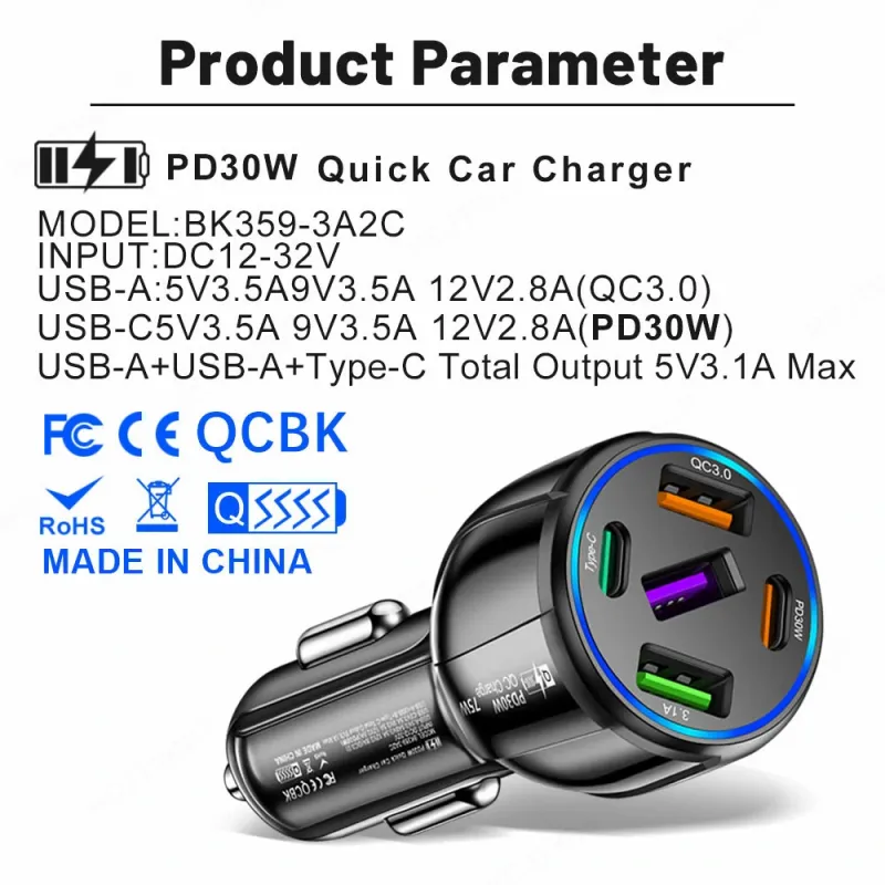 75W 5-Port USB PD Car Charger Adapter 3USB-A+2USB-C PD QC3.0 Fast Charging for iPhone 15 15 Plus 15Pro 15Pro Max for Huawei Mate60 Pro for Samsung Galaxy Z Flip4 for Xiaomi 13pro