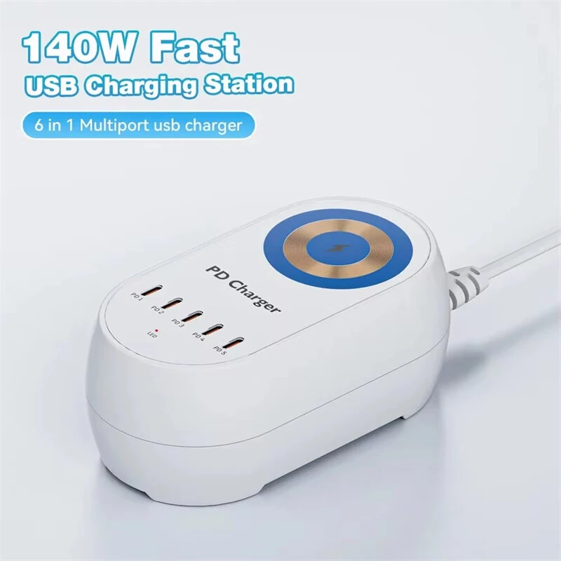 [GaN Tech] Bakeey 140W 5-Port USB PD Charger Desktop Charging Station with 15W Wireless Charger Fast Wireless Charging Dock for Smart Phones for iPhone 15 14 13 Pro for Samsung for Xiaomi for Laptop Tablet