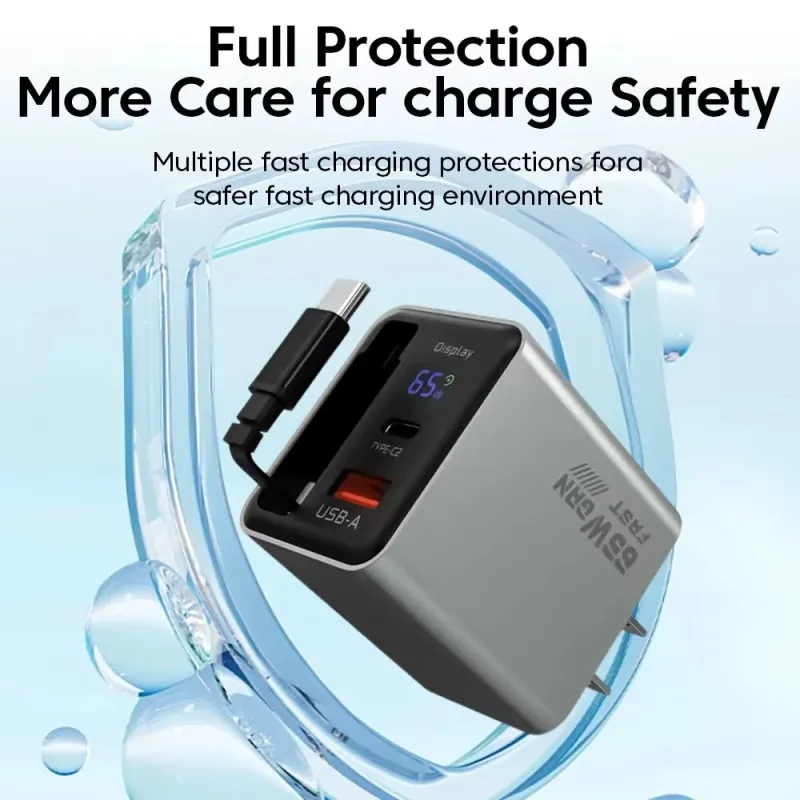 [GaN Tech] XY-1065 65W 2-Port USB PD Digital Display Charger with Type-C Retractable Cable PD Fast Charging Wall Charger Adapter EU Plug for iPhone 17 17 Pro 16 Pro Max 15 14 for Xiaomi 17pro for Samsung Galaxy S25 Ultra for Huawei Mate XTs