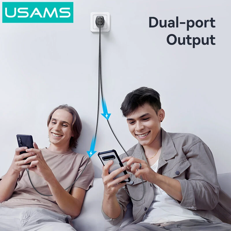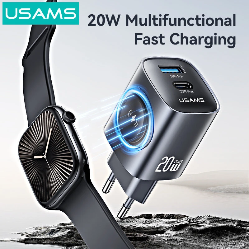 [GaN Tech] USAMS CC293 T67 20W 2-Port USB PD Charger with iWatch Wireless Charging Function USB-A+Type-C Fast Charging Wall Charger Adapter EU Plug for iPhone 16 16 Pro 15 14 13 Pro Max for Huawei Mate XT for Xiaomi 15pro for Apple Watch