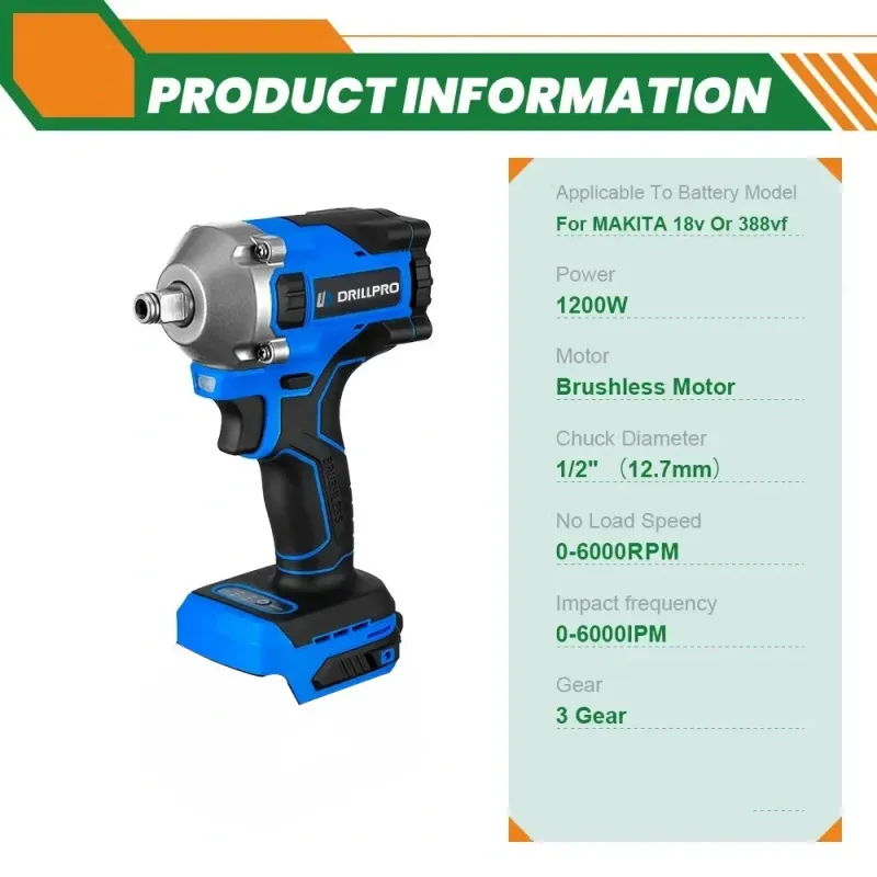 Drillpro 1000N.m High-Torque Brushless Electric Cordless Wrench Adjustable 3 Gears with LED Work Light High Impact Cordless Tool Compatible with Mak Battery