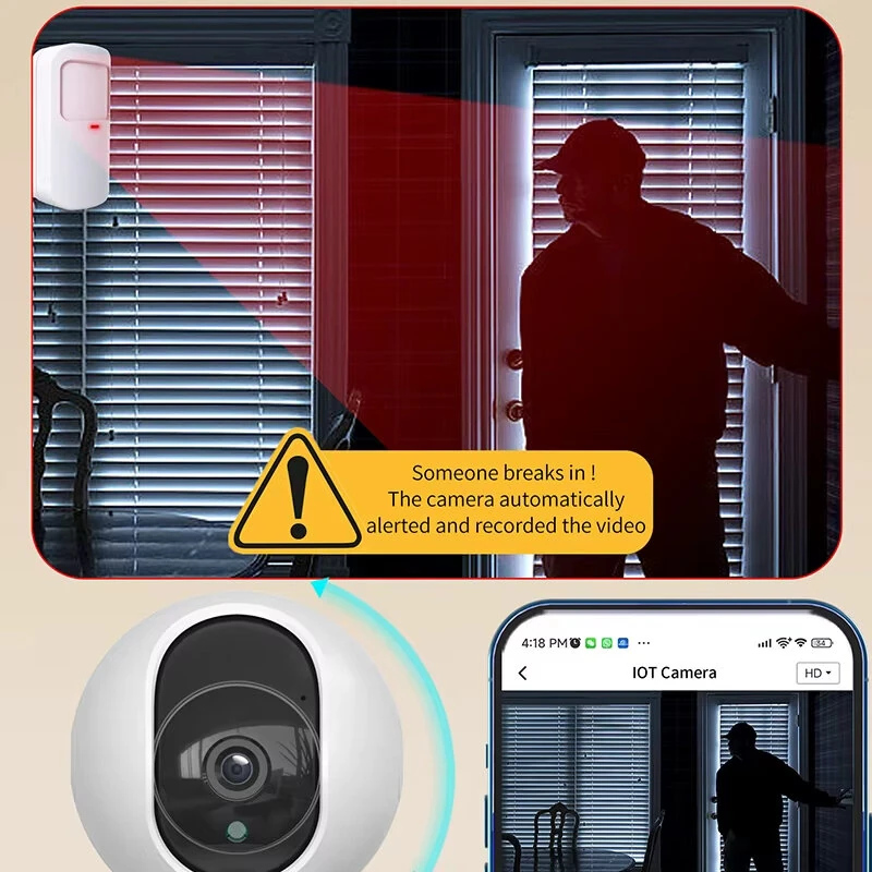 2MP WiFi IOT Camera Smart Home Security Burglar Alarm System Wireless PTZ IR Night Vision Motion Detect Two-way Intercom APP Control Indoors Surveillance Cam with Door and Window Sensor Body IR Sensor