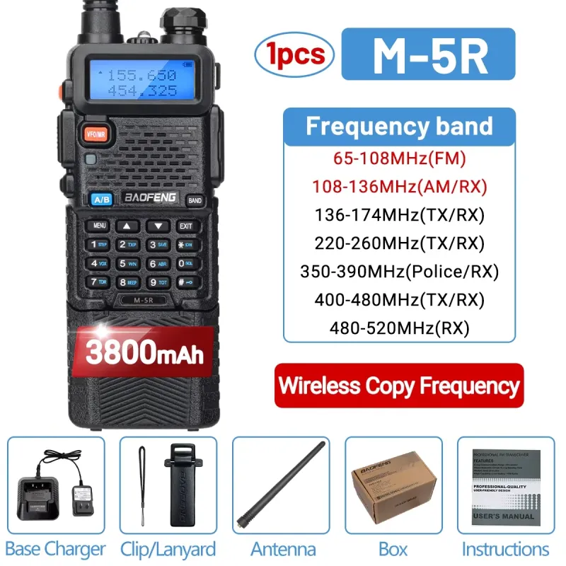 Baofeng M-5R Walkie-Talkie 5W 8W Power Extended Version One-Key Frequency AM Aviation Full-Band 3800mAh Battery Outdoor Radio