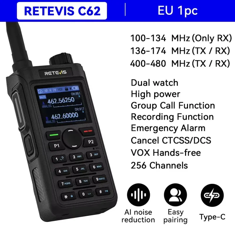 Retevis C62 5W Long Range Walkie Talkie VHF/UHF Dual Mode Professional Two-Way Radio for Camping