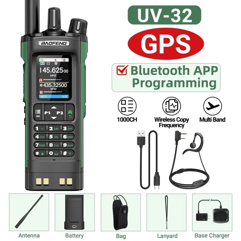 Baofeng BF-UV32 GPS Walkie Talkie 10W Long Range Multi Band Bluetooth App 1000 Channels USB-C EU Charge Portable 2-Way Radio