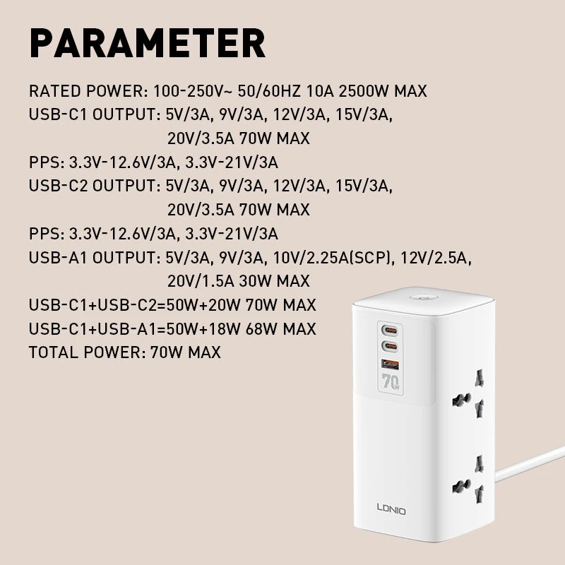LDNIO 7 in 1 2500W Tower Extension Power Socket 70W Charging Station USB Power Strip with 4 Outlets and 2USB-C+USB-A Port Extension Cord