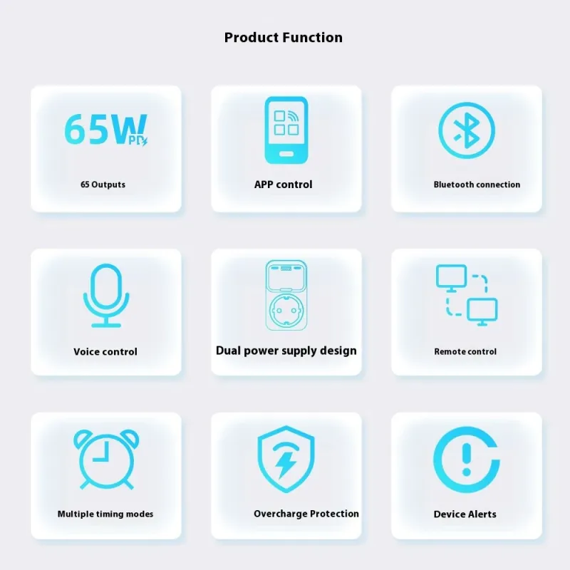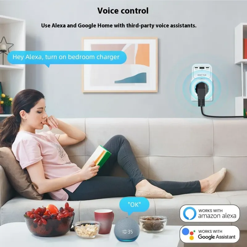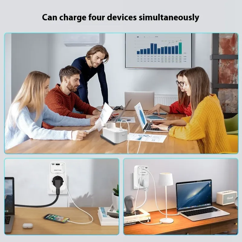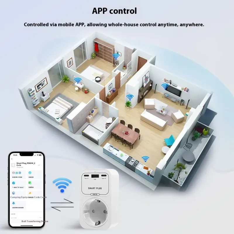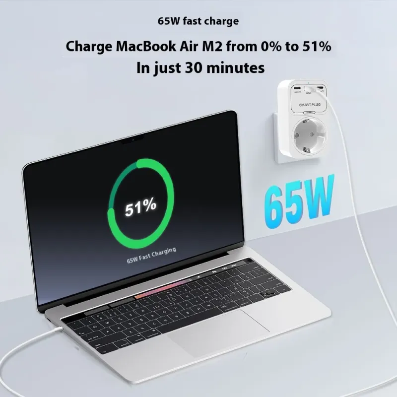 OT50 Tuya Smart WiFi GaN Fast Charger EU Socket 65W PD Charging 2 Type-C+USB-A Ports APP Remote Push Timing Function Voice Control with Alexa Google Assistant