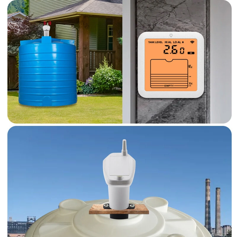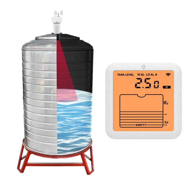TS-FT007 Ultrasonic Water Level Meter with LCD Display 0.5-5M Range Wireless 100M Transmission IP65 Waterproof Home Tank Gauge with High Low Alarm Non Contact Measurement