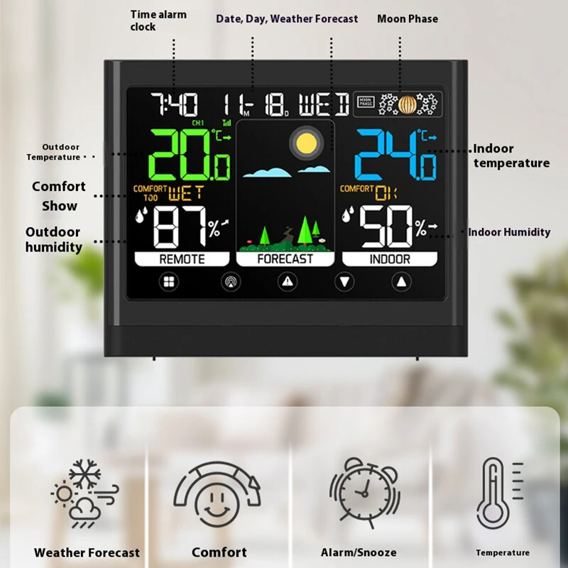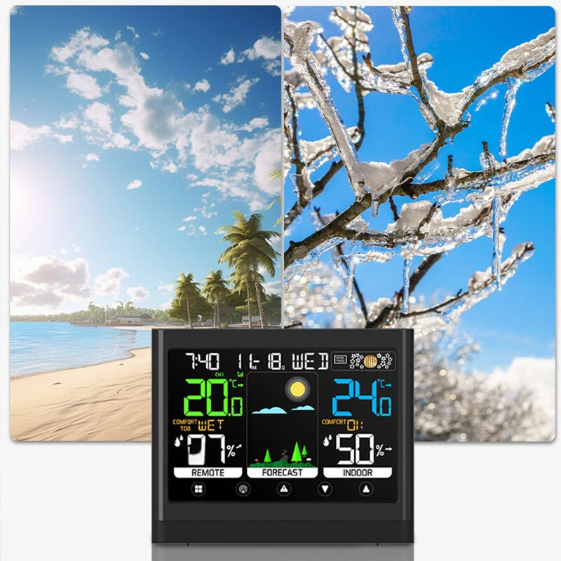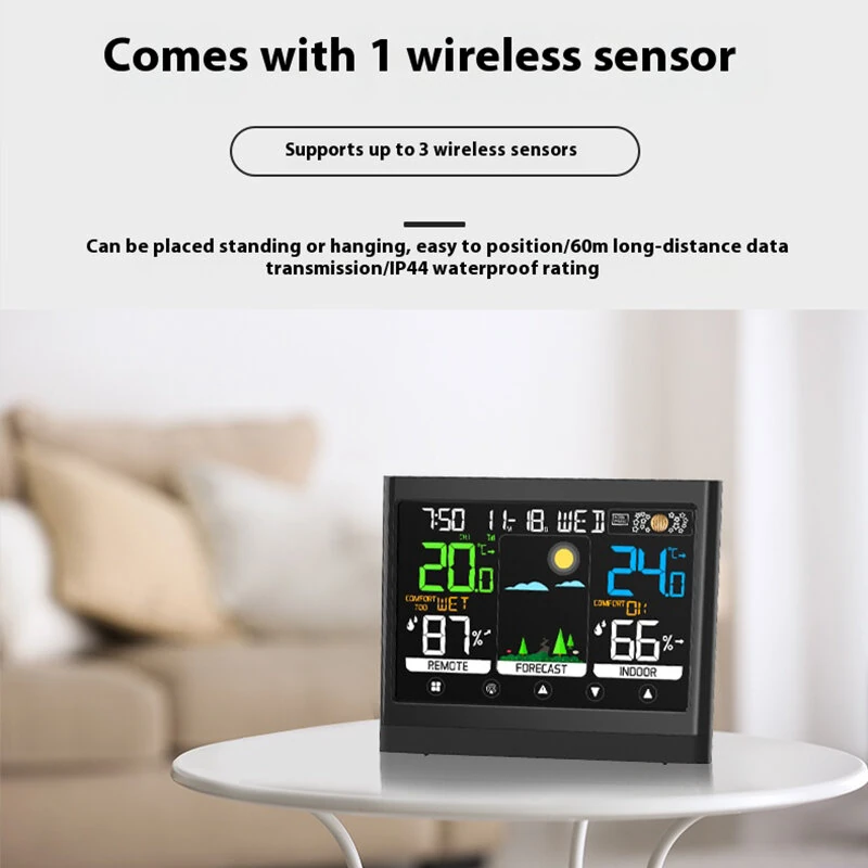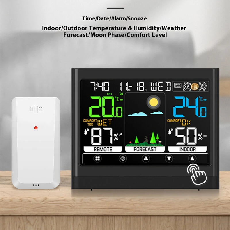 Wireless Weather Station Touchscreen Display Indoor Outdoor Temperature Humidity Forecast Moon Phase Comfort Level with Sensor