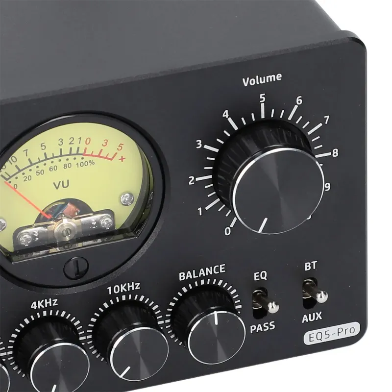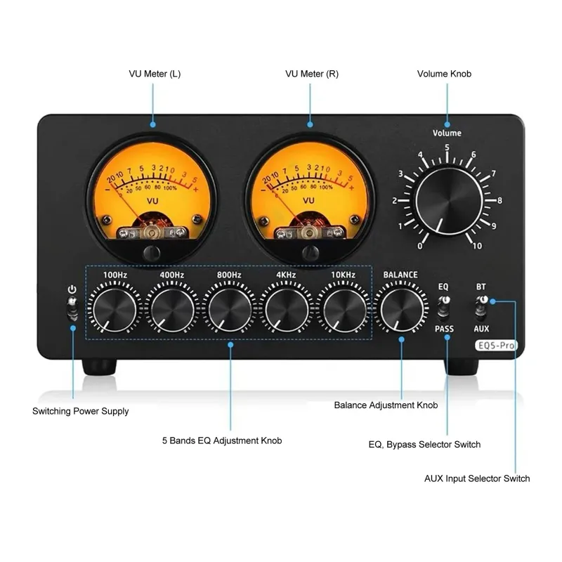 5 Band EQ Equalizer Pre-amplifier bluetooth 5.0 Vintage VU Meter Stereo RCA AUX 100Hz to 10KHz Frequency Control Home Stereo Computer Speakers Amplifiers USB Type C Signal Loss Minimization