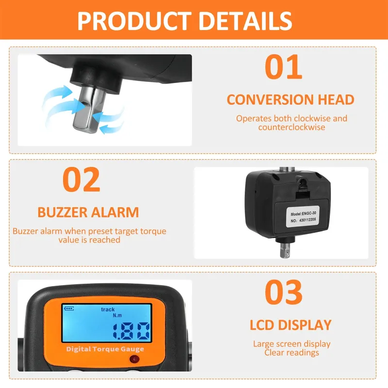 Digital Torque Meter 1/2'' to 1/4'' 1/2'' to 3/8'' Adapters High Accuracy 4 Torque Units Backlit Display For DIY & Home Repairs