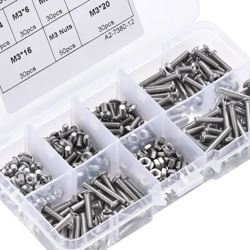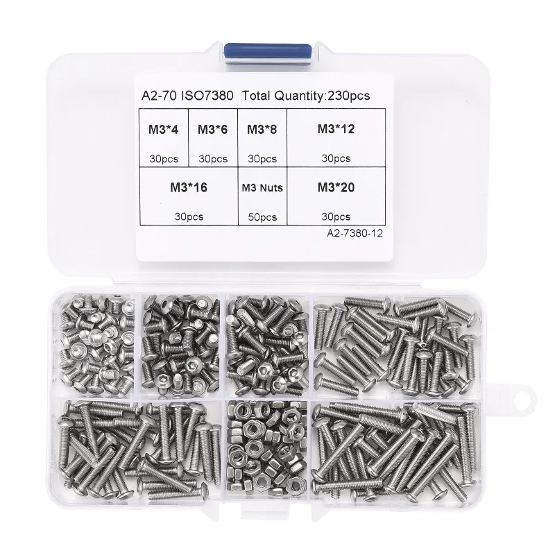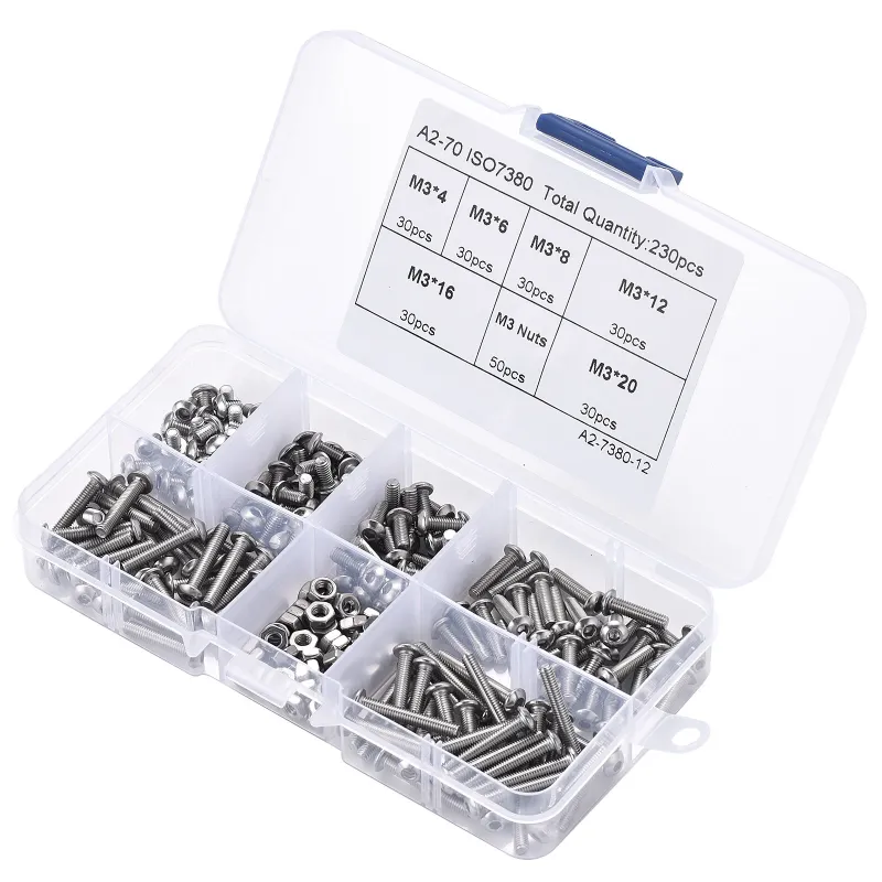 230pcs M3 304 Stainless Steel Allen Hex Drive Button Head Socket Cap Bolts Screws Nuts Assortment Kit Box Nuts Allen bolts Set