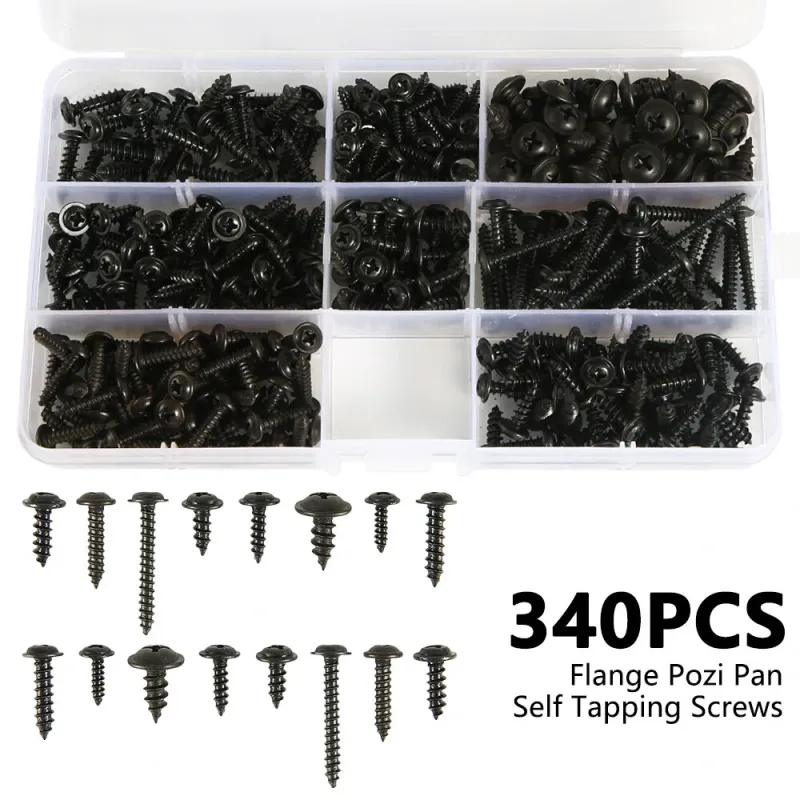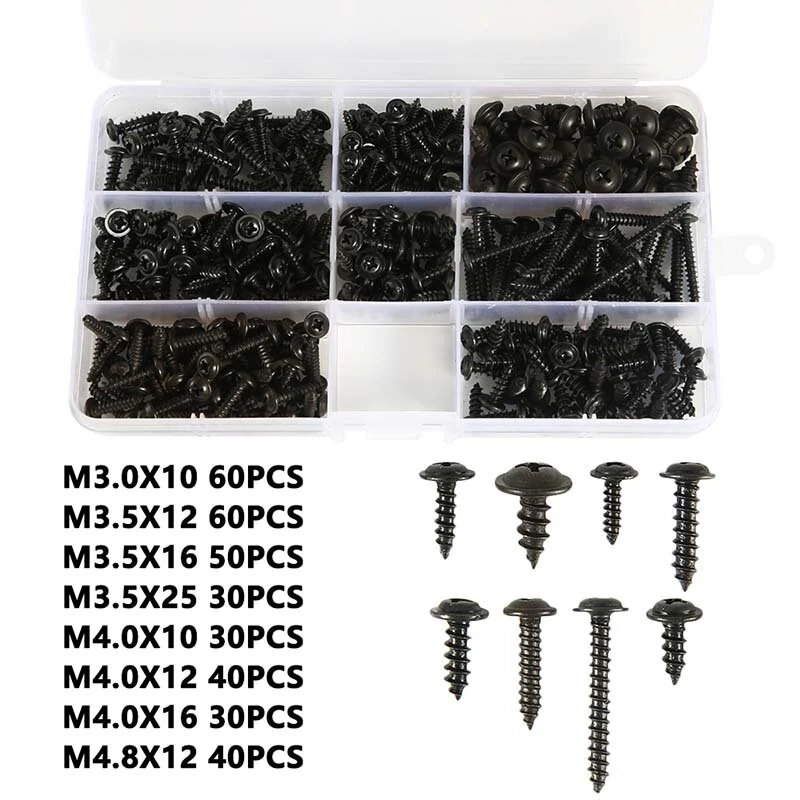 340Pcs Pan Head Tapping Screw Cross Head M3/M3.5/M4/M4.8 Self Tapping Screw Set Assortment Kit Black Furniture Carbon Steel