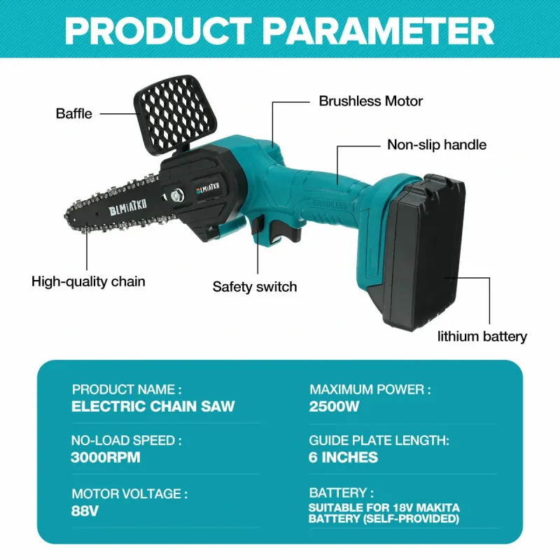 BLMIATKO 88VF 6 Inch Cordless Electric Chainsaw 3000W One-hand Handheld Garden Saws Wood Cutter