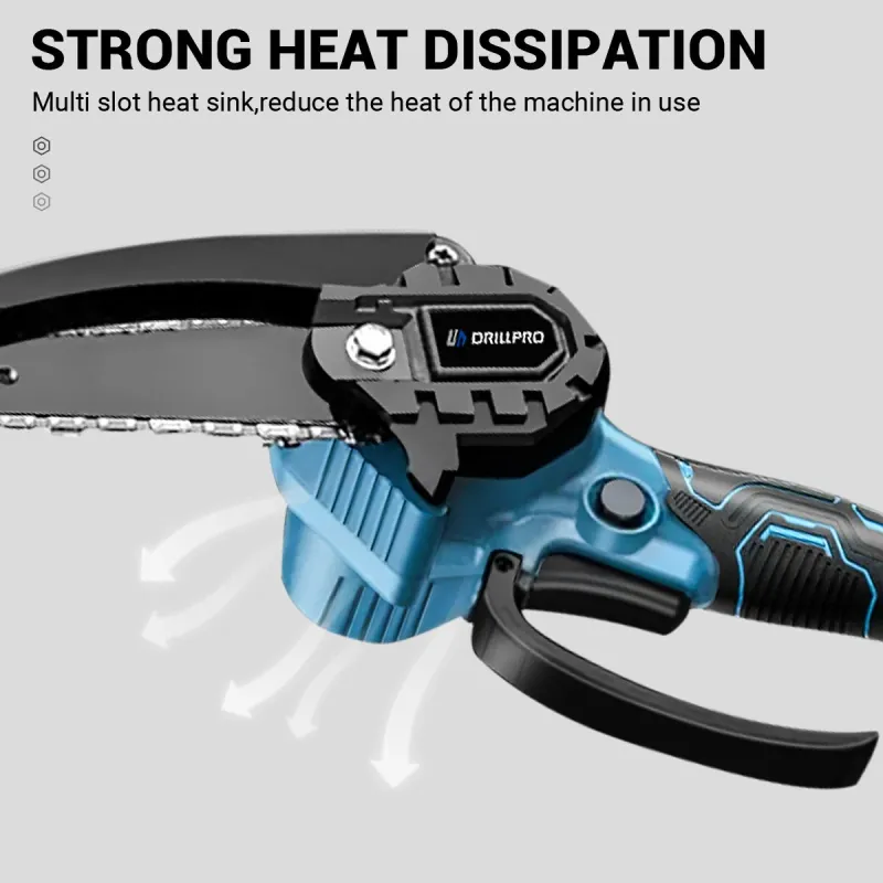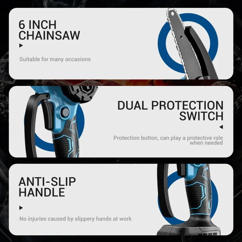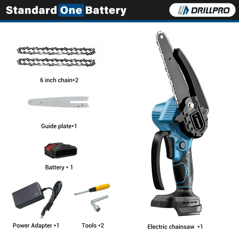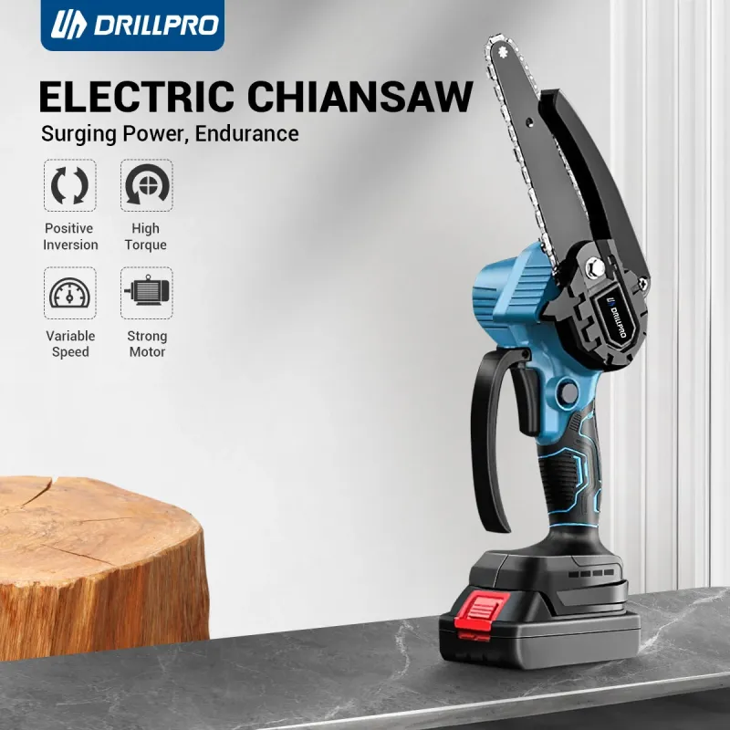 Drillpro 6 Inch Mini Cordless Chainsaw with Safety Lock High-Capacity Battery Ultra-Light Weight Easy-Use Garden Pruning Cutting Tool Woodworking Handheld Outdoor Equipment