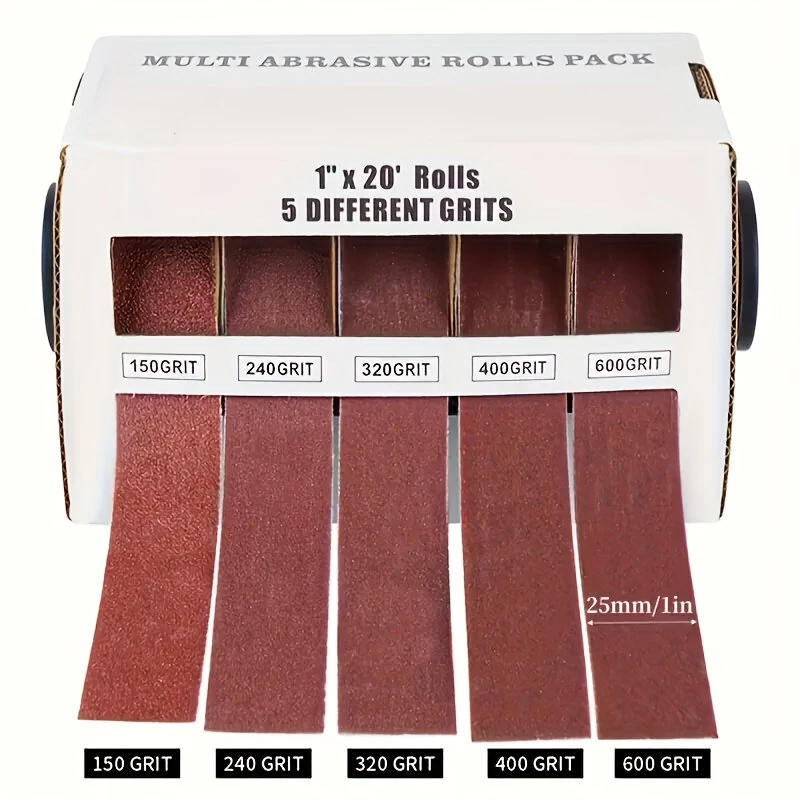 Emery Sandpaper 5 Rolls Abrasive Cloth Aluminum Oxide 150 240 320 400 600 Grit 25mm x 6m Woodworking Metal Automotive Polishing Dispenser Box
