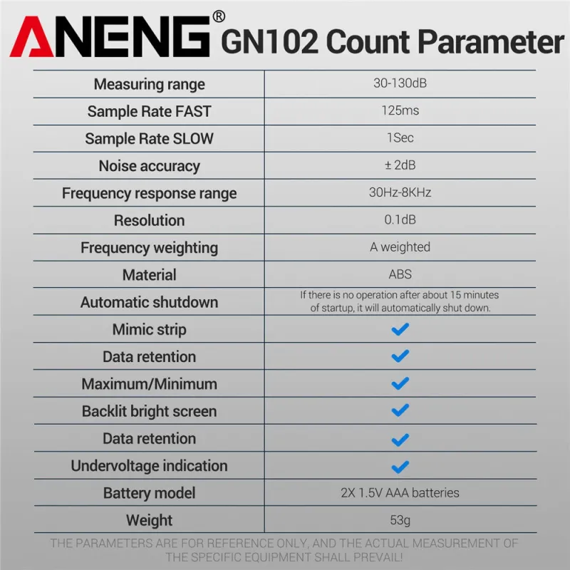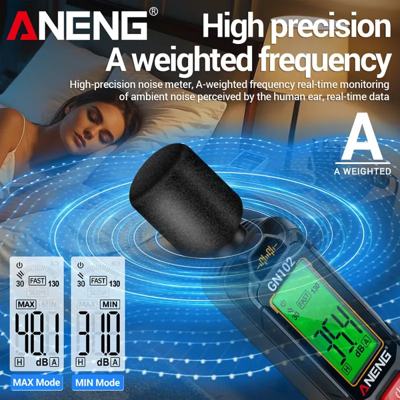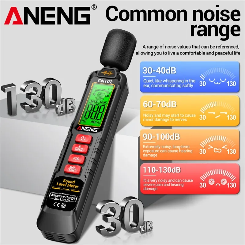 ANENG GN102 Digital Noise Meter 30-130dB Sound Level Meter LCD Backlit Display Compact Design Accurate Measurement