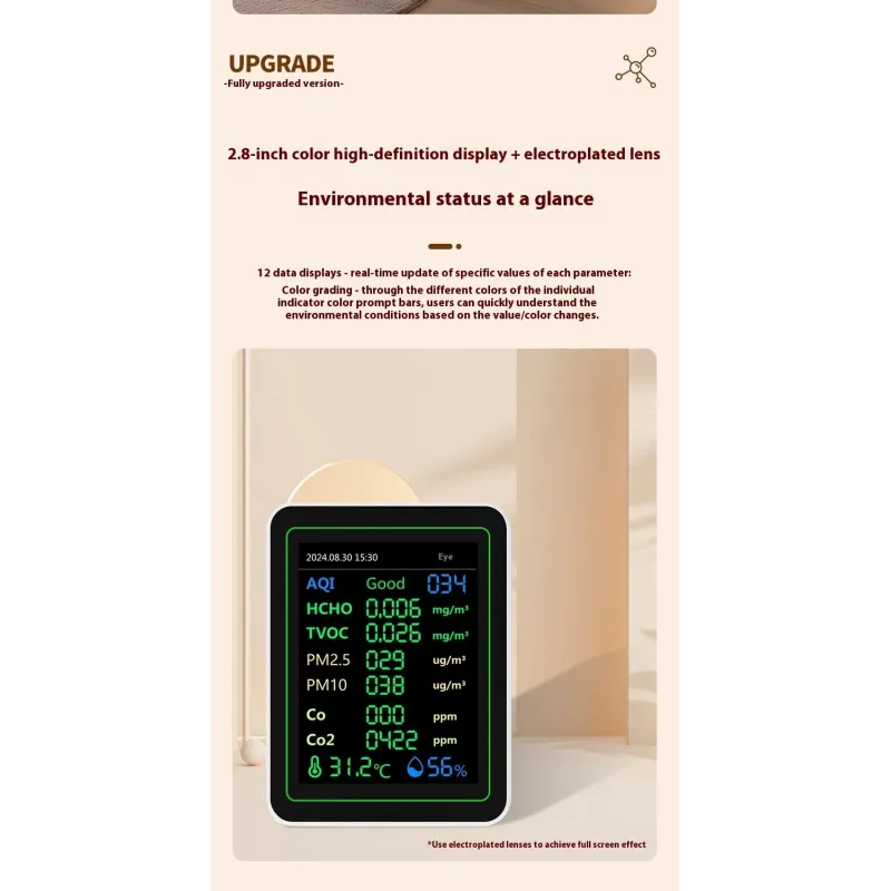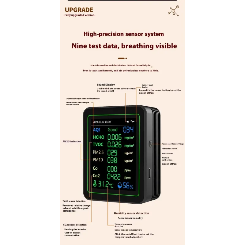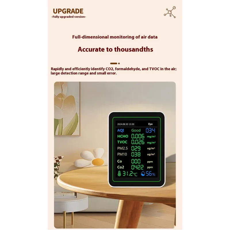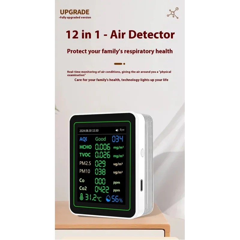 NEW 12 in 1 Air Quality Monitor Formaldehyde Space Contrast Function TVOC CO CO2 PM2.5 PM10 Temperature Humidity LCD Display Rechargeable Precision Sensor Real Time Detection Compact Design ZN-MT14