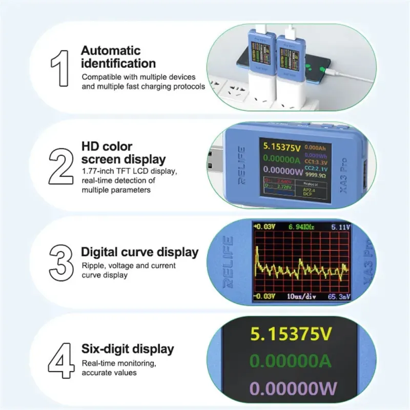 RELIFE XA3 Pro USB Smart Tester PD QC2.0 QC3.0 Fast Charge 6.5A High Current 156W Power Measurement 1.77-inch TFT LCD