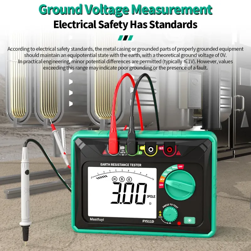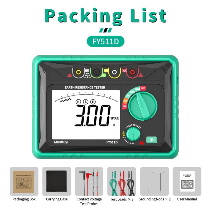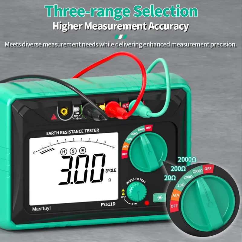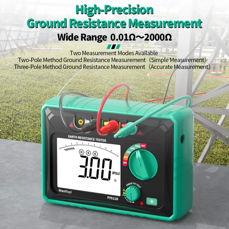 FY511D Earth Resistance Tester 0~2k Range 600V Voltage Measurement High Accuracy LCD Backlit Screen Grounding Rods Portable Electric Testing Equipment
