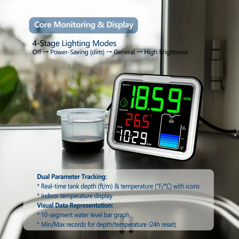 Smart Ultrasonic Water Tank Level Monitor Real Time Depth Temperature Sensor 0-5m Accuracy 0.03m Wireless Signal 500ft Multi Channel LCD Display for Home and Agriculture Tracking