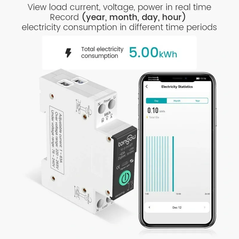 Tuya Intelligent Circuit Breaker with Metering 1P 63A DIN Rail Support 3 Timing Modes Multiple Safety Protecting APP Remote Control Compatible with Alexa Google Assistant for Household Appliances